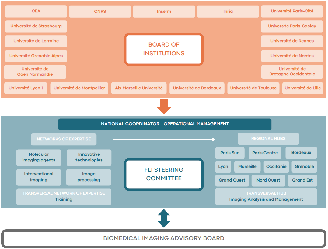 Under the supervision of the CEA, Régine TREBOSSEN, assisted by a national steering committee, and a board of institution coordinates France Life Imaging.