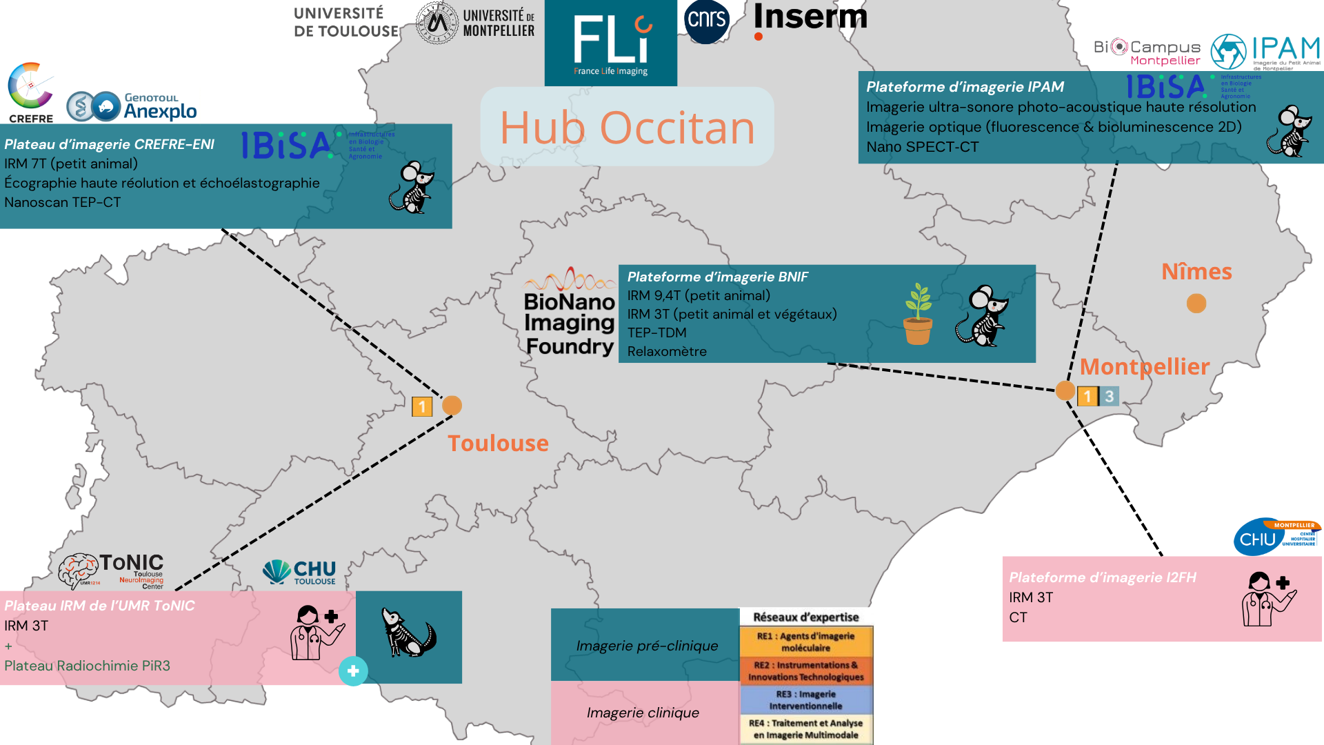 Historically, the hub was located in the Lyon region, but since the beginning of 2025, it has been expanded to accommodate the In Vivo Imaging Auvergne (IVIA) imaging platform located in the Clermont-Ferrand region.